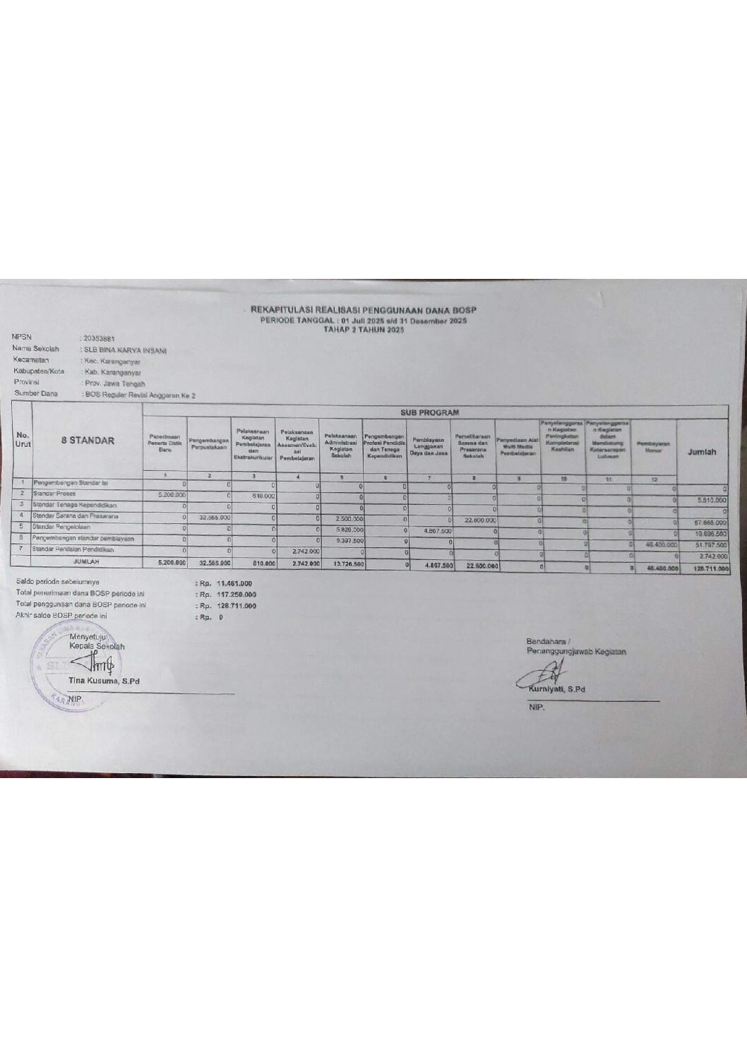 Ini adalah laporan BOS tahap 1 tahun 2025 milik SLB Bina Karya Insani Karanganyar, Jawa Tengah